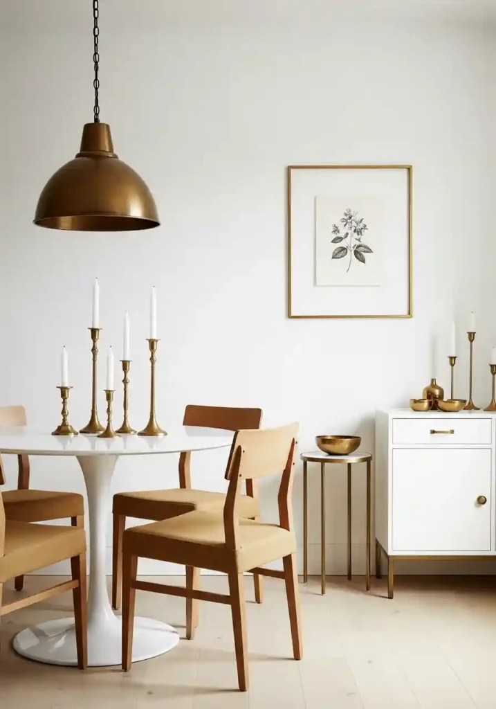 Warm metallic accessories — aged brass, warm gold, and unlacquered bronze — create a specific quality of light-reflecting warmth in small dining rooms that painted surfaces and fabric textiles cannot generate independently. The metallic surfaces catch available natural and artificial light and scatter it throughout the room in small warm highlights that increase the room’s apparent luminosity and dimensional complexity without adding any visual mass or consuming any physical space. This light-scattering quality is particularly valuable in small dining rooms where increasing luminosity is one of the most effective spatial expansion techniques available.