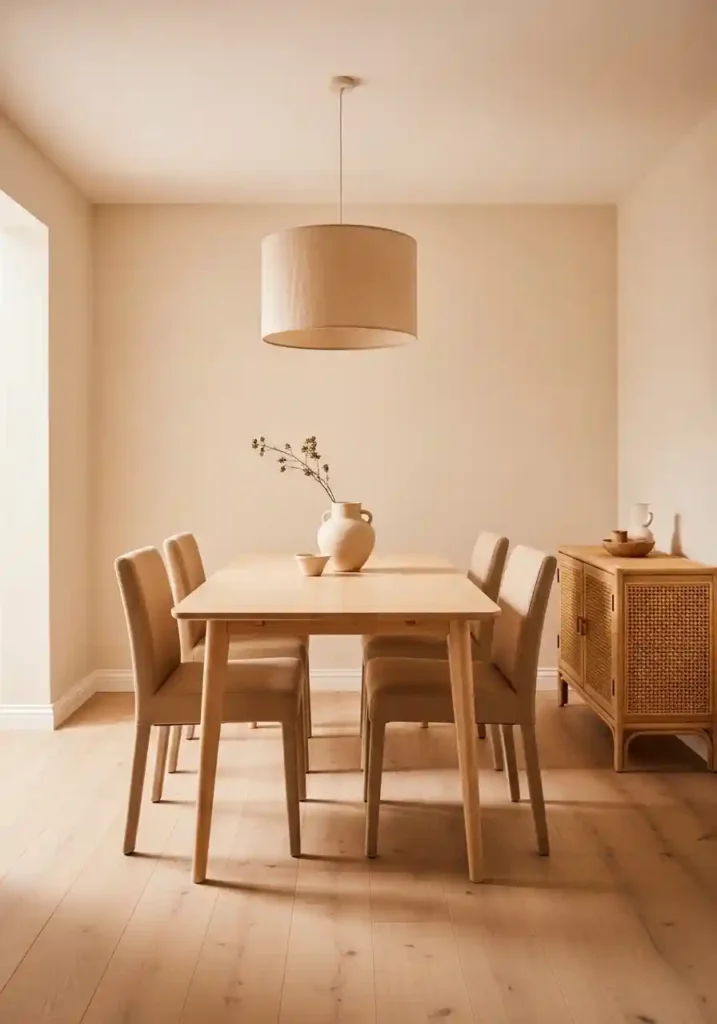 A consistently warm neutral palette applied throughout every element of a small dining room creates spatial generosity through tonal unity rather than physical expansion. When walls, floor, furniture, and textiles all share the same warm family of cream, ivory, sand, and honey tones, the eye perceives the space as a single continuous warm volume rather than a collection of separate elements within a constrained boundary. This visual merging of surfaces and objects within a unified tonal family makes the room’s actual boundaries less perceptible, reducing the psychological experience of limitation that small spaces create when their edges are clearly and contrastingly defined.