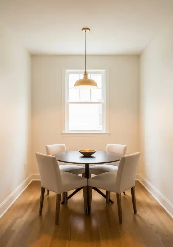 Warm white paint in a satin rather than matte finish creates a light-reflective quality across wall surfaces that increases a small dining room’s apparent luminosity by reflecting artificial and natural light around the room from every wall surface simultaneously. Matte paint absorbs light at the wall surface, while satin paint reflects it, creating a warmer and more luminous room experience from the same light sources. This increased apparent luminosity directly contributes to the spatial perception of generosity — brighter rooms feel larger, fresher, and more open than dimmer rooms at identical actual dimensions, making finish selection a genuinely meaningful spatial decision in small dining rooms.