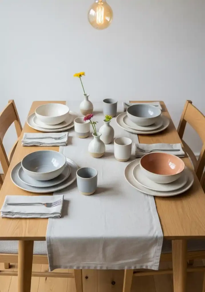 The most effective artisan ceramic table setting for a small dining room uses a consistent but not matching approach — all pieces from the same potter or the same studio, sharing a glaze palette and general material vocabulary, but each individual piece genuinely unique in its specific form. This creates visual harmony without the sterility of identical pieces. Individual handmade bud vases with single stems at each place setting replace a central floral arrangement and create a more intimate, more personally scaled table decoration. Simple linen napkins complete a table setting of extraordinary quiet beauty that makes every weekday meal feel genuinely worth sitting down for.