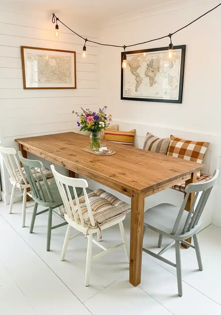 The fixed bench also creates a visual anchor for the dining space in open-plan rooms, functioning as a spatial boundary element that defines the dining zone without requiring a physical partition. Colorful cushions on the bench surface introduce the personality and warmth that makes the dining corner feel genuinely inhabited and personally expressive. Mismatched chairs on the opposite side create the collected, layered character that contemporary interior design favors strongly. Together this configuration achieves greater seating capacity, greater spatial efficiency, and greater visual warmth than any conventional chair-only arrangement in the same footprint.