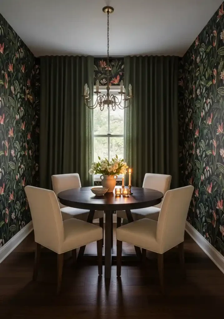 Applying the same bold wallpaper to all four walls rather than a single accent wall creates the most dramatic and the most genuinely immersive effect. Four walls of deep midnight green botanical paper creates a complete dining environment of distinct identity and complete atmospheric courage. Keeping every other element in the room simple — cream linen chairs, a dark walnut table, an aged brass chandelier, a simple fresh flower arrangement — allows the wallpaper to perform at its absolute best without visual competition. This is one of the most saved small dining room approaches on visual discovery platforms because the impact is immediate, emotional, and genuinely extraordinary.