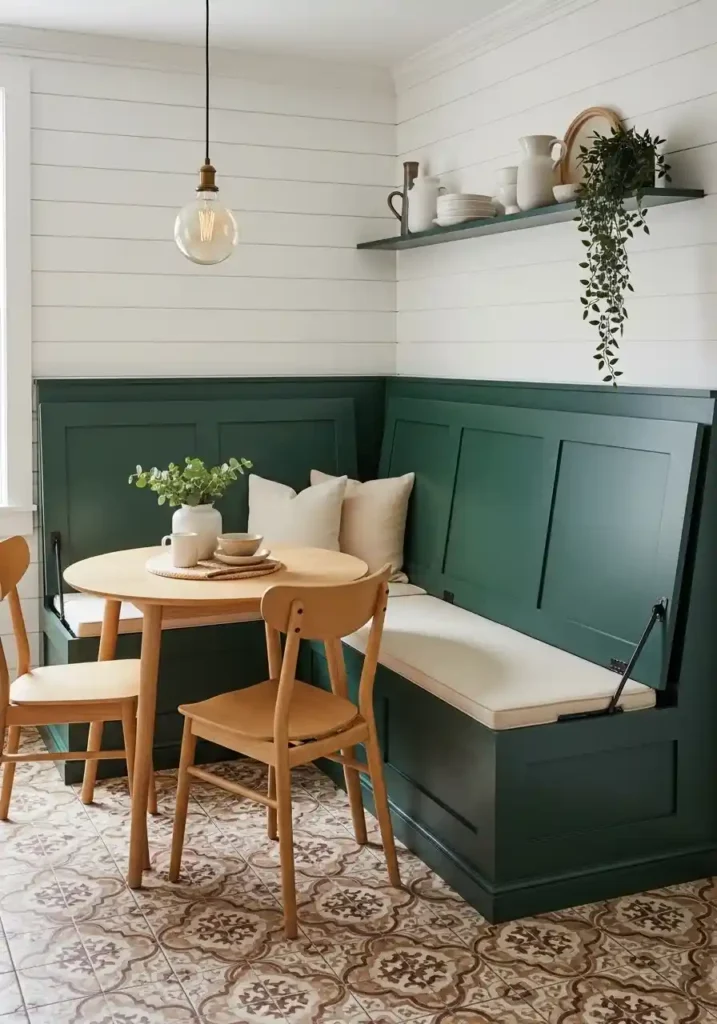 The L-shaped configuration allows a small table to seat significantly more people than its surface area would suggest possible with conventional chairs alone. When you need to seat six in a space designed for four, the banquette delivers without requiring extra chairs that need storing between uses. Forest green painted panels create strong visual character that makes the built-in feel like an intentional design feature rather than a practical afterthought. Add a small shelf above for ceramics and a trailing plant and the entire corner becomes the most characterful and most genuinely intelligent spot in the home.