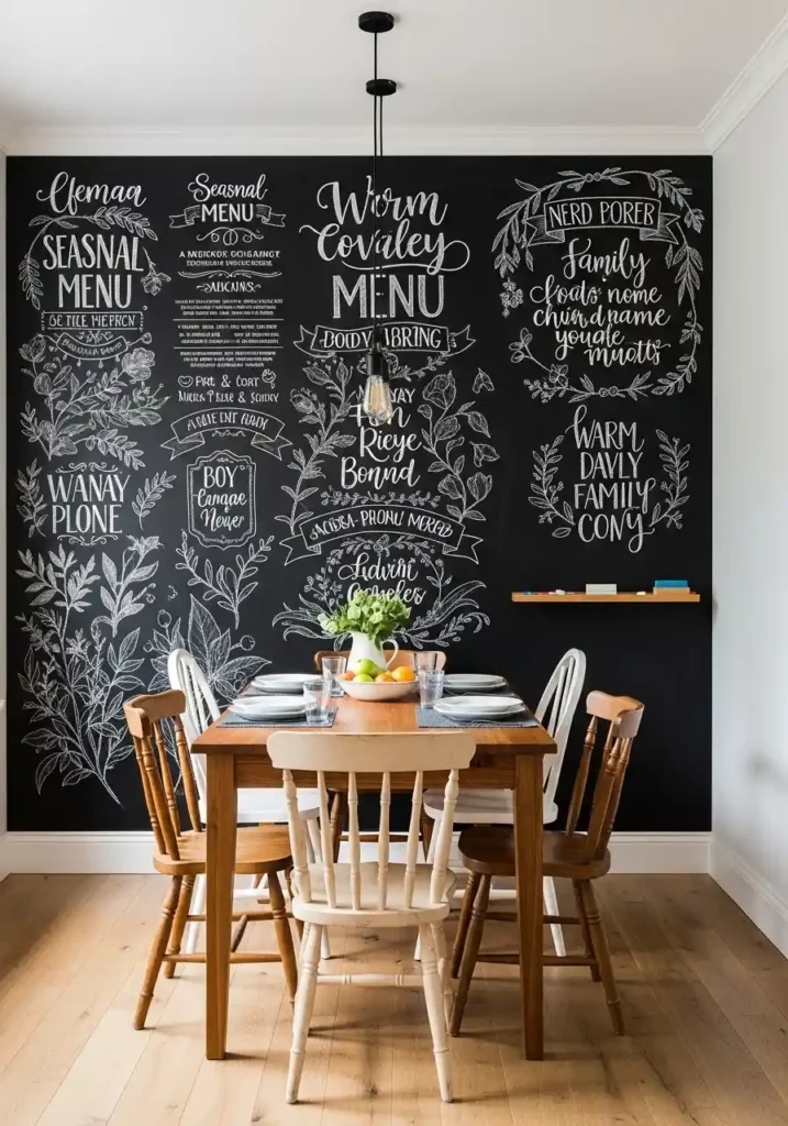 A full-height chalkboard wall behind the dining table is the most genuinely alive and the most continuously personal dining room backdrop available. Unlike art, paint, or wallpaper, the chalkboard wall changes with every week, every season, and every family mood. A beautifully hand-lettered seasonal menu for Tuesday’s dinner, a chalk botanical illustration of the herbs growing on the windowsill, a child’s drawing left from the weekend — each layer creates a dining backdrop of extraordinary individual warmth that communicates the specific personality of the specific household inhabiting the space with complete authenticity and daily freshness.