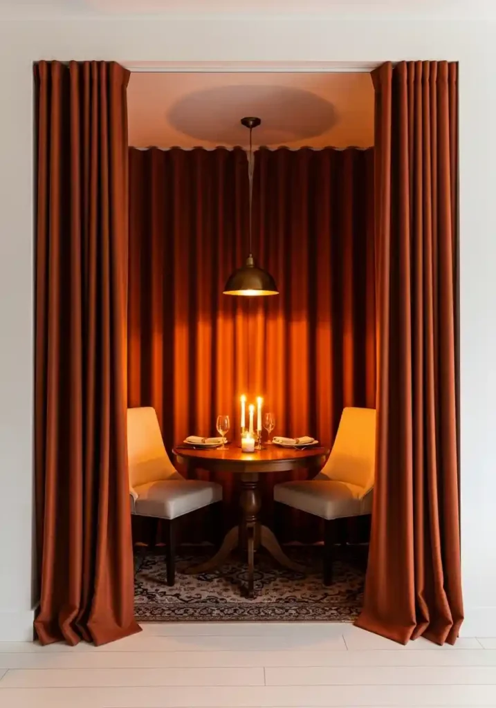 Creating a dining nook within a larger room using ceiling-mounted curtain panels is one of the most dramatic and the most affordable architectural-effect techniques available in small home design. Heavy linen curtain panels in a warm terracotta or forest green tone frame the dining area with soft textile walls that create genuine visual enclosure without blocking light or permanent structural change. The result feels theatrical in the best possible sense — a specifically defined intimate space within a larger room that communicates deliberate design intention without requiring any renovation, permission, or significant expense.