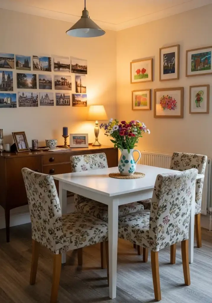 A carefully assembled gallery wall above a small dining table creates the most personally revealing and the most genuinely warm dining backdrop available, because real personal photographs, genuinely loved artworks, and meaningful maps and prints communicate the specific individual character of the specific household in a way that no commercially purchased decorative panel ever manages. The gallery wall above the dining table is seen from every seat at every meal and becomes a continuous backdrop for daily life that grows richer and more meaningful with every piece added over months and years of genuine collecting and intentional curation.