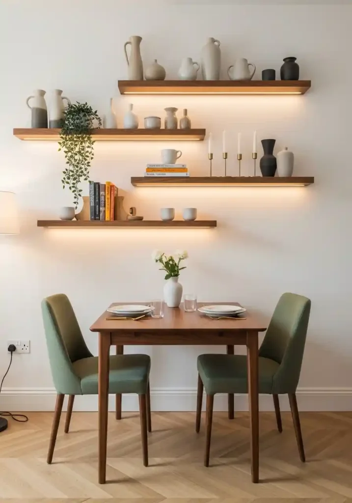Warm LED strip lighting mounted beneath each shelf creates beautiful ambient illumination that serves as both display lighting and mood lighting for evening meals, reducing the need for additional lamp sources in a small space. The walnut shelf material echoing the walnut dining table creates material cohesion that makes the wall installation feel architecturally integrated rather than decoratively added. A trailing plant cascading from the highest shelf adds organic warmth and movement overhead. This approach works particularly well for homeowners who want a genuinely personal dining atmosphere without undertaking any significant renovation or construction work.