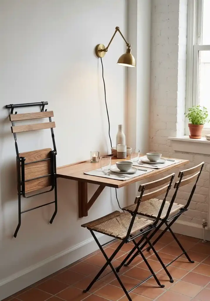 The accompanying folding chairs mounted on wall hooks beside the table complete the system beautifully. Everything stores against the wall in a compact, visually organized arrangement that reads as a deliberate design feature rather than a space-saving compromise. Warm walnut veneer for the table surface and natural cane seat chairs in black metal frames create material warmth that prevents the utilitarian concept from feeling cold. A single adjustable brass wall sconce provides the dedicated dining illumination that distinguishes this corner from the surrounding room and creates the specific quality of atmospheric warmth that transforms eating into dining.