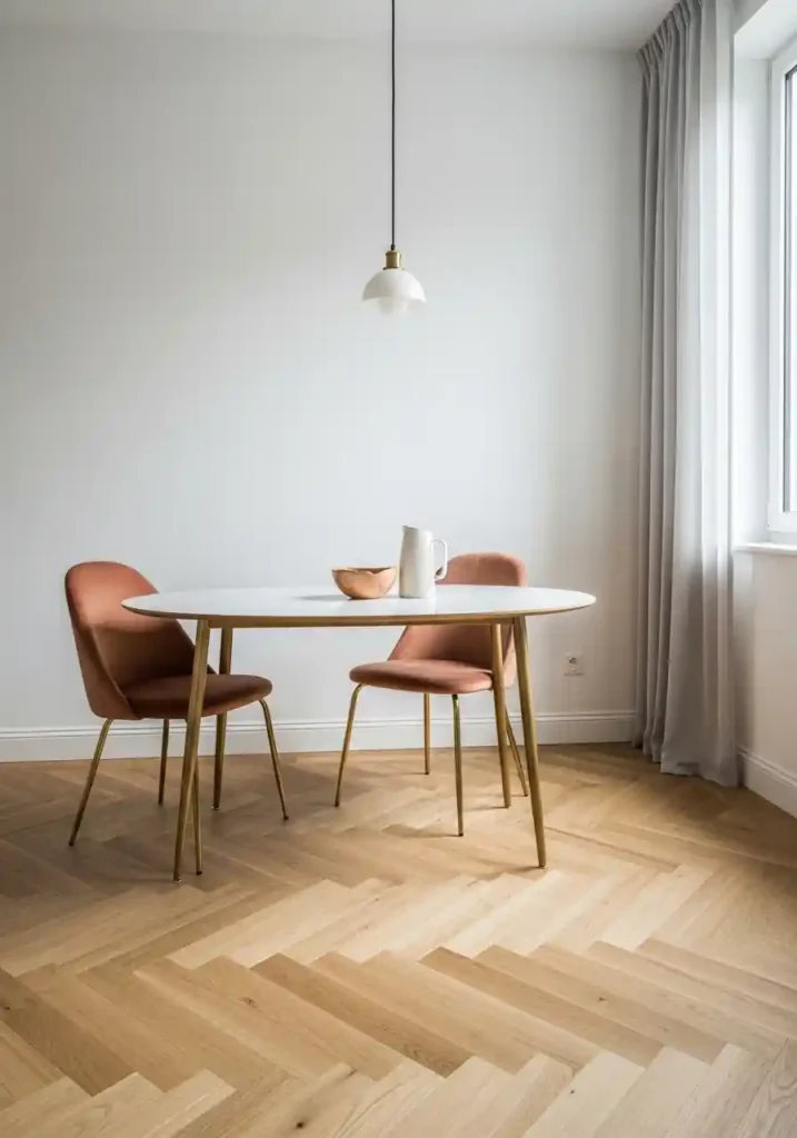 A simple oval table in warm white with slim gold legs floating above an extraordinary herringbone floor creates a visual hierarchy that lets the floor be the hero while the furniture provides elegant functional support. Dusty blush velvet chairs add warmth without competing with the floor’s visual interest. The restraint of white walls and a single simple brass pendant keeps everything else in the room unobtrusive so the floor’s architectural character receives undivided visual attention. This is the approach that explains why discerning interior designers consistently advise clients to invest disproportionately in flooring before any other purchase in a small room.