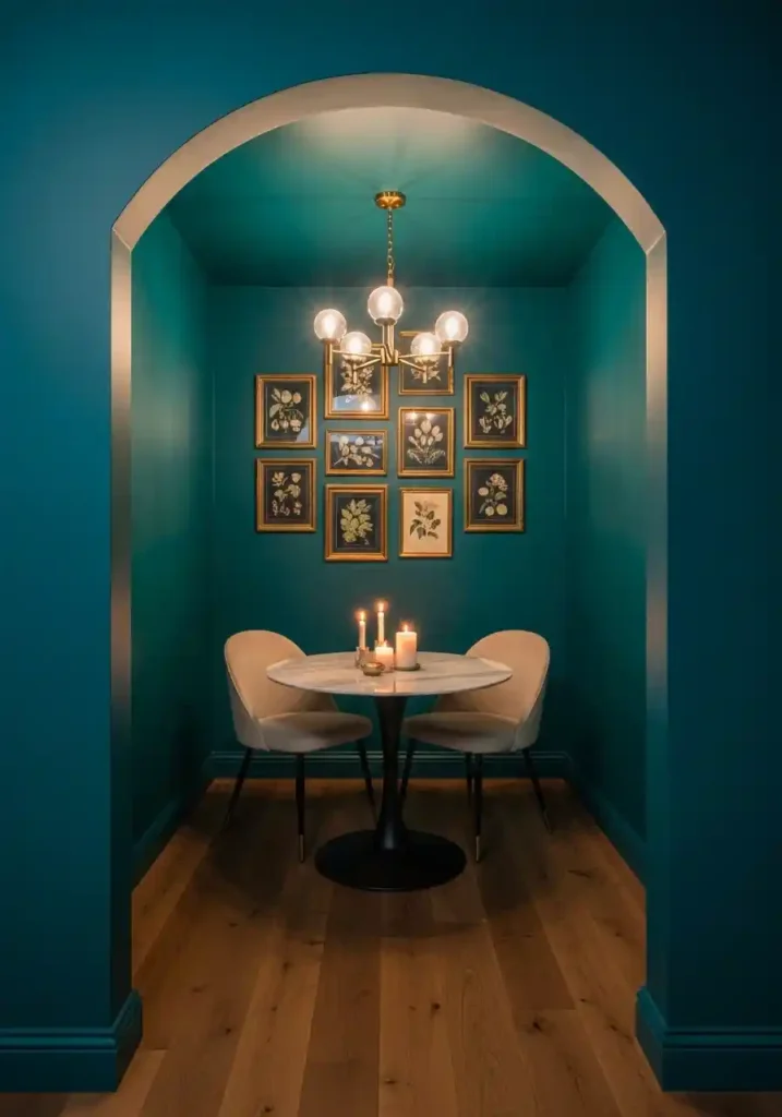 Painting a small dining nook in a single deep jewel tone — teal, forest green, midnight navy, or deep plum — on all four walls and the ceiling creates the most instantly atmospheric and the most genuinely cozy dining experience available at any budget level. Small spaces respond particularly powerfully to this all-over color treatment because the intimate scale amplifies the immersive effect, creating a jewel box quality that larger rooms simply cannot achieve with the same application. Every element within the colored nook appears more luminous, more precisely chosen, and more warmly beautiful against the saturated dark backdrop.