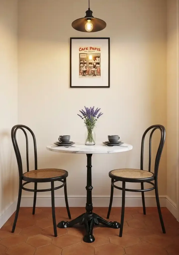 The two matching black metal bistro chairs with warm rattan seats tuck fully beneath the marble top when not in use, reducing the table’s visual and physical footprint to essentially the diameter of the marble surface alone. This retractability is fundamental to small dining room function — the ability to reclaim floor space between meals transforms a dedicated dining area into a flexible multi-purpose zone that supports working from home, creative projects, or casual socializing with equal ease. A small glass vase of fresh lavender and a vintage French cafe print above complete a dining corner of genuine European character and enduring daily pleasure.