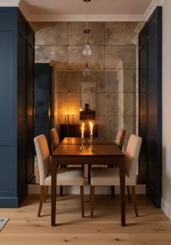 An antique mercury glass mirror with warm amber tinting creates softer, more atmospheric reflections than clear modern glass, making candlelit dinners particularly beautiful within the doubled space. Deep navy walls flanking the mirror create the saturated color backdrop that makes the reflected warm light appear even more luminous by contrast. A crystal droplet pendant above adds the overhead sparkle that catches and multiplies within the reflective surface. For small dining rooms seeking maximum atmospheric impact from minimum investment, this combination delivers consistently extraordinary results.