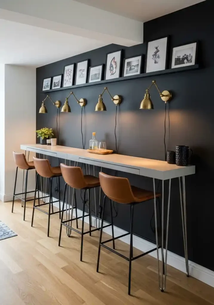 Individual swing-arm brass wall sconces above each seat position create the specific quality of warm, adjustable task lighting that transforms a simple counter into a genuinely pleasant dining and working surface. This multi-functionality is particularly valuable in homes where the dining table also serves as a work from home desk, a creative workspace, or a morning reading station. The deep charcoal feature wall behind the console creates the visual backdrop that defines the dining wall as a deliberate architectural feature rather than a simple furniture placement, elevating the entire configuration significantly above its modest dimensions.