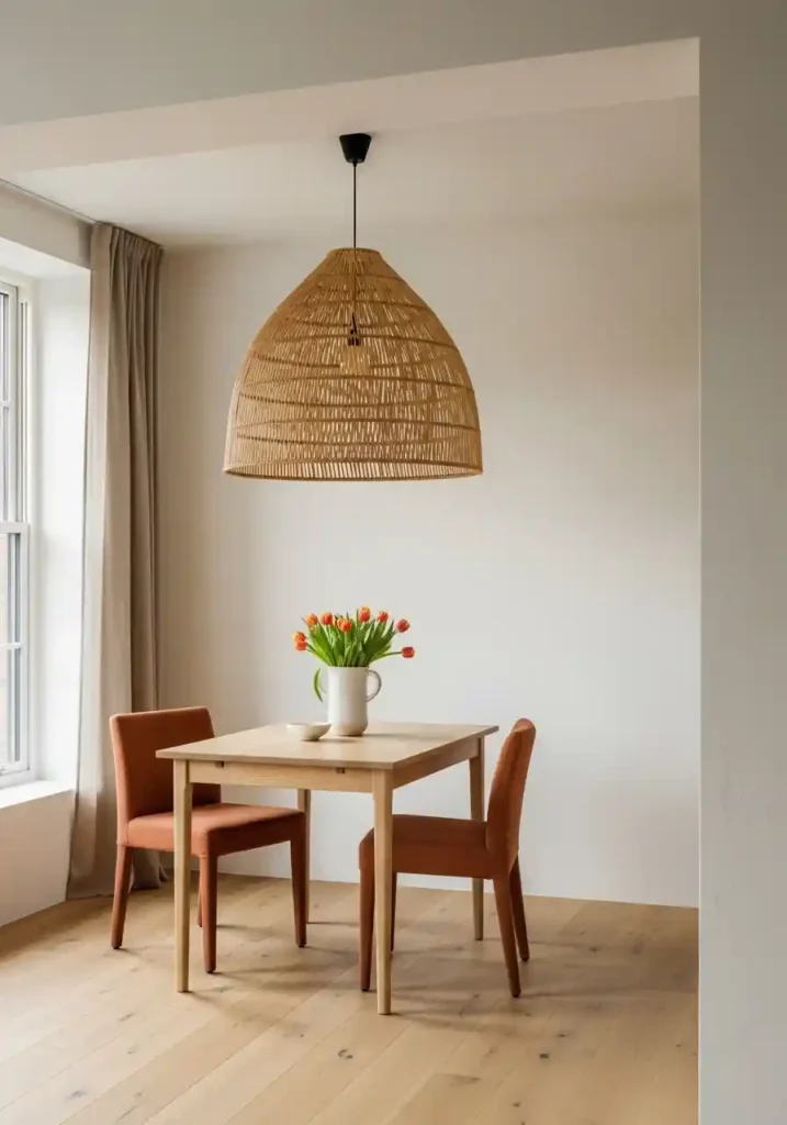 A large natural rattan pendant in warm honey tones brings organic texture to the overhead space that no paint color or artwork can replicate. The woven material filters light warmly and creates beautiful dappled shadow patterns on the ceiling and walls around it during evening dining. For homeowners styling small dining spaces on careful budgets, replacing a generic builder-grade ceiling fitting with a dramatically scaled rattan or woven fiber pendant is consistently the highest-return single purchase available. The spatial transformation it creates is immediate, complete, and requires no other changes to the room to take full effect.