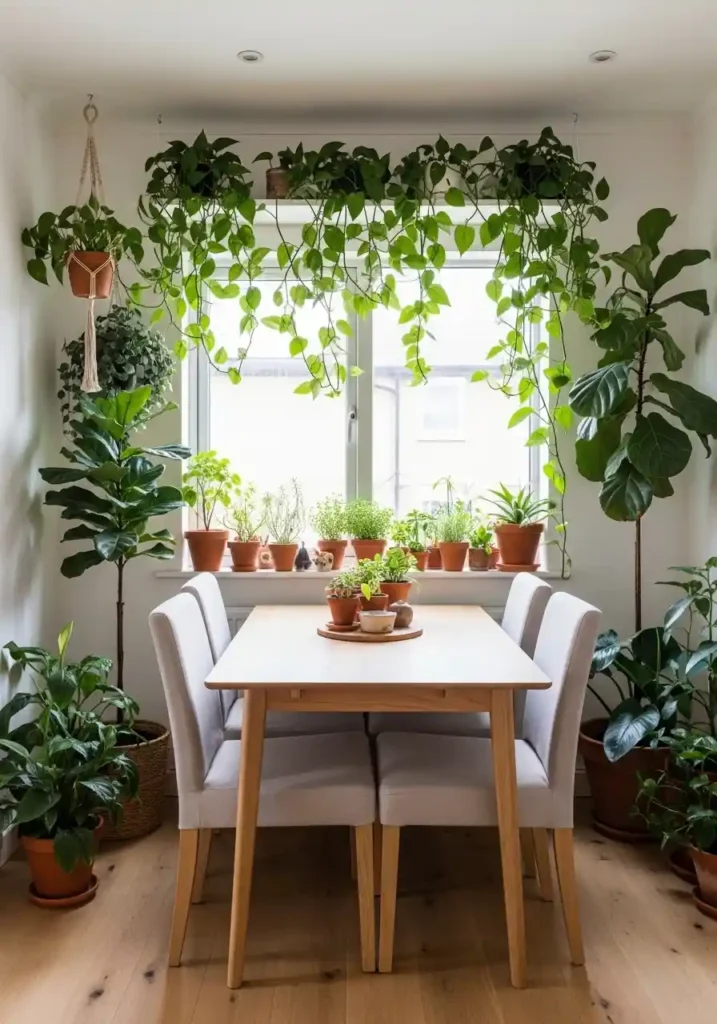 The key to creating a beautiful plant-filled small dining room is species selection based on the room’s specific light conditions rather than aesthetic preference alone. A sunny dining room with good natural light supports fiddle leaf figs, trailing pothos, and most herbs without difficulty. A north-facing room requires different species — snake plants, peace lilies, and ZZ plants — that thrive in lower light conditions. Choosing species suited to actual conditions creates the genuinely thriving, genuinely abundant botanical environment that photographs beautifully and functions genuinely well rather than the struggling, yellowing plant collection that results from choosing plants for appearance alone.