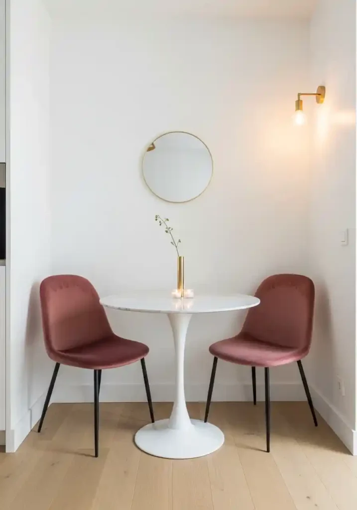 Positioning a small dining table directly in front of the room’s most generous window solves the most persistent problem in compact dining spaces: the absence of atmosphere. Natural daylight and an outdoor view provide inexhaustible visual interest that no artwork, no wall treatment, and no decorative accessory can replicate at any price. Every meal at this table comes with a changing sky, a seasonally shifting garden view, and the specific quality of natural light at that particular time of day. This is genuinely free interior design of the highest possible quality, available to anyone with a window and a table small enough to sit before it.