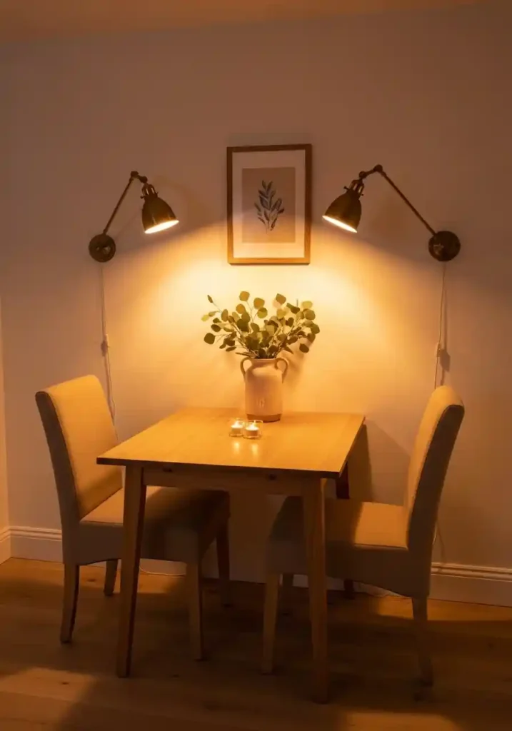 Wall-mounted swing-arm sconces positioned on either side of a small dining table create the most intimate and the most flattering dining lighting possible without any ceiling fixture installation. The lateral positioning of the light sources creates warm, dimensional illumination that is genuinely flattering to both food and people in ways that overhead lighting cannot replicate. Overhead light casts unflattering downward shadows. Side-positioned sconces create the warm, diffused lateral illumination that the best restaurants invest significantly in achieving and that the best dinner parties are defined by. For small dining areas where a ceiling pendant might feel too dominant, sconces provide the perfect alternative.