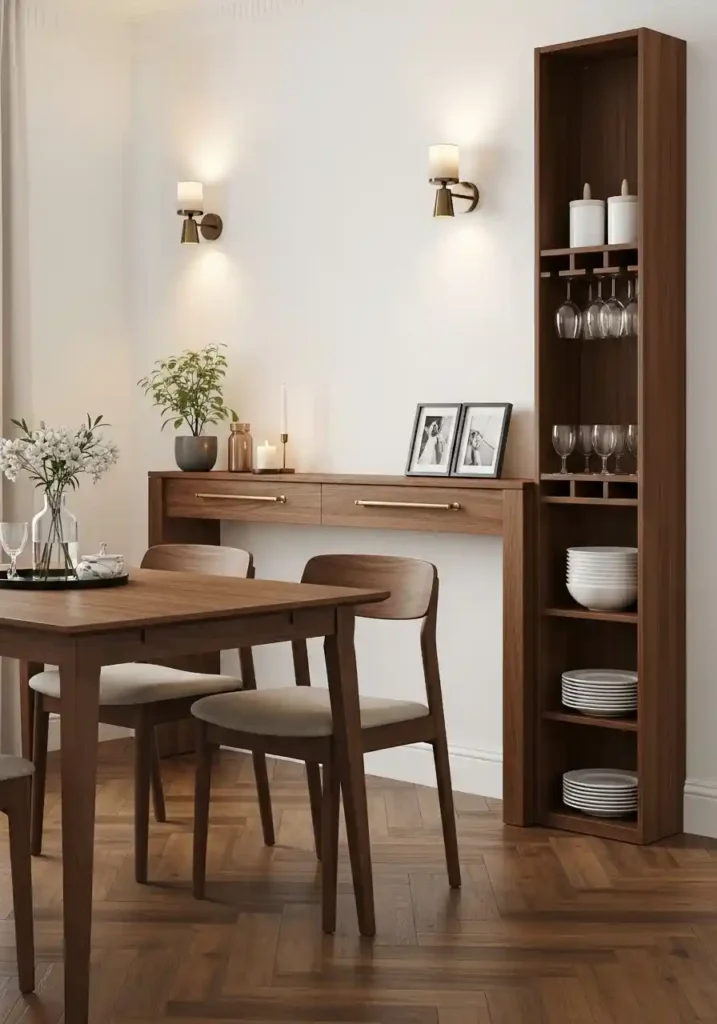 A slim sideboard at 25 centimeters depth provides the best storage-to-footprint ratio. Built-in banquette seating with hinged lid storage beneath combines seating and storage within a single furniture footprint. Wall-mounted floating shelves above head height provide display and storage without consuming any floor space. These three solutions combined address most small dining room storage needs without reducing floor clearance.