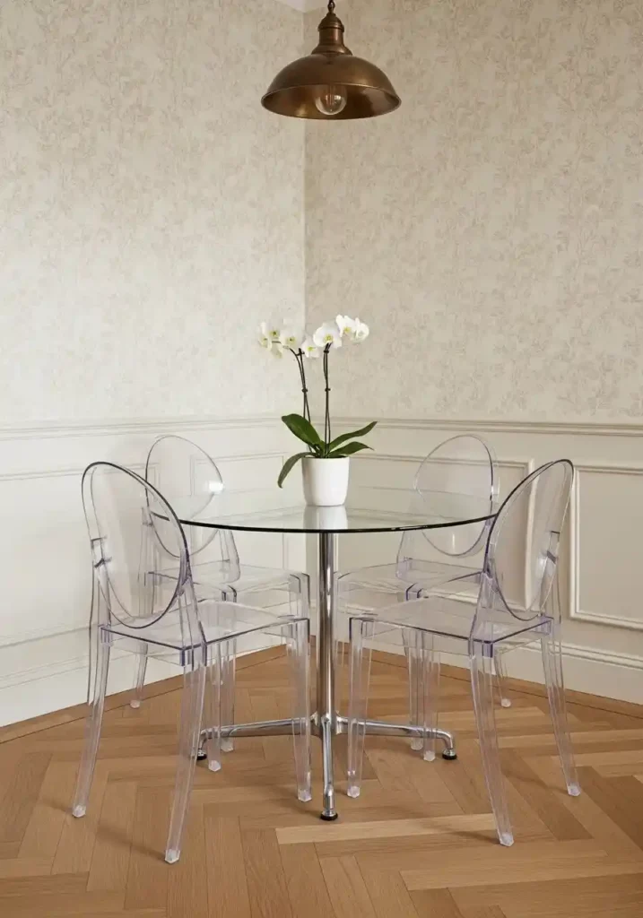 The practical consideration worth knowing is that high-quality acrylic furniture requires careful cleaning to avoid surface scratching and maintains its clarity better than budget alternatives. Quality ghost chairs by established manufacturers are significantly more durable and more visually refined than lower-cost imitations, and the investment is justified by the daily spatial benefit they deliver in small rooms. A single white ceramic orchid on the transparent table and a warm aged brass pendant above provide the only visual anchors the room needs, creating a dining space that feels genuinely airy, genuinely considered, and genuinely more spacious than any measurement would suggest.