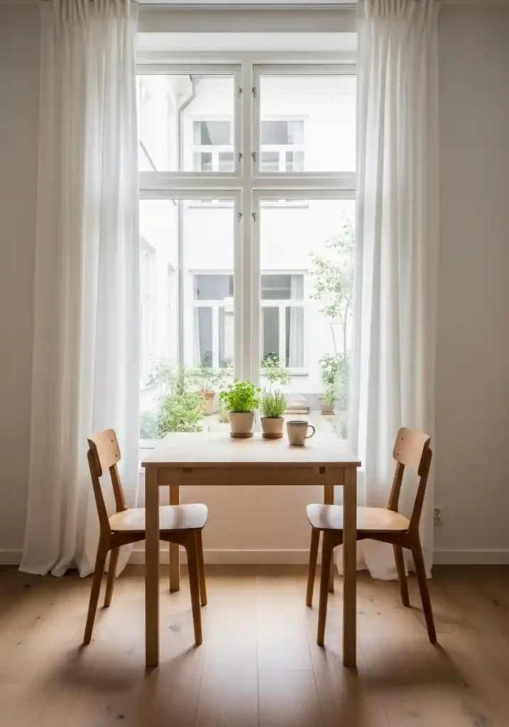 The practical styling of a window dining table should be deliberately minimal to avoid blocking any portion of the view that provides the essential experience. A small ceramic herb pot and a single mug are genuinely all that belongs on this table’s surface during daily use. Sheer linen curtains frame the window without filtering the light or the view. Scandinavian-style wooden chairs keep the surrounding visual environment clean and unobtrusive. The result is a dining space that feels more spacious, more calming, and more genuinely pleasurable to use every single morning than any more elaborately decorated dining area in the same home could achieve.