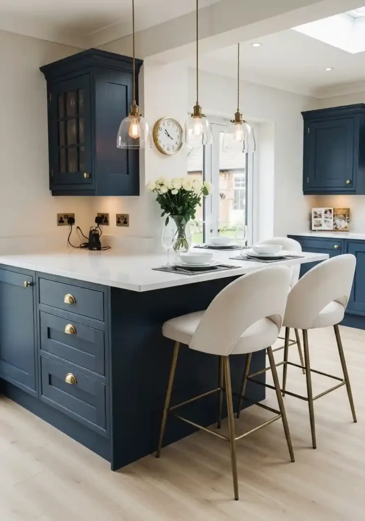 The most magnificently beautiful custom island small kitchen remodels are those where the island dimensions are genuinely calculated for the specific kitchen’s available clearance — 90cm of clear pathway on all non-seating sides is the absolute minimum for comfortable single-cook movement! Deep navy blue painted island base with white quartz waterfall-edge top creates the most dramatically beautiful and the most broadly admired island color combination. Three deep soft-close drawers on the working side. One open display shelf. A 40cm seating overhang with two slim cream upholstered bar stools. Two pendant lights. The perfectly designed island transforms everything.