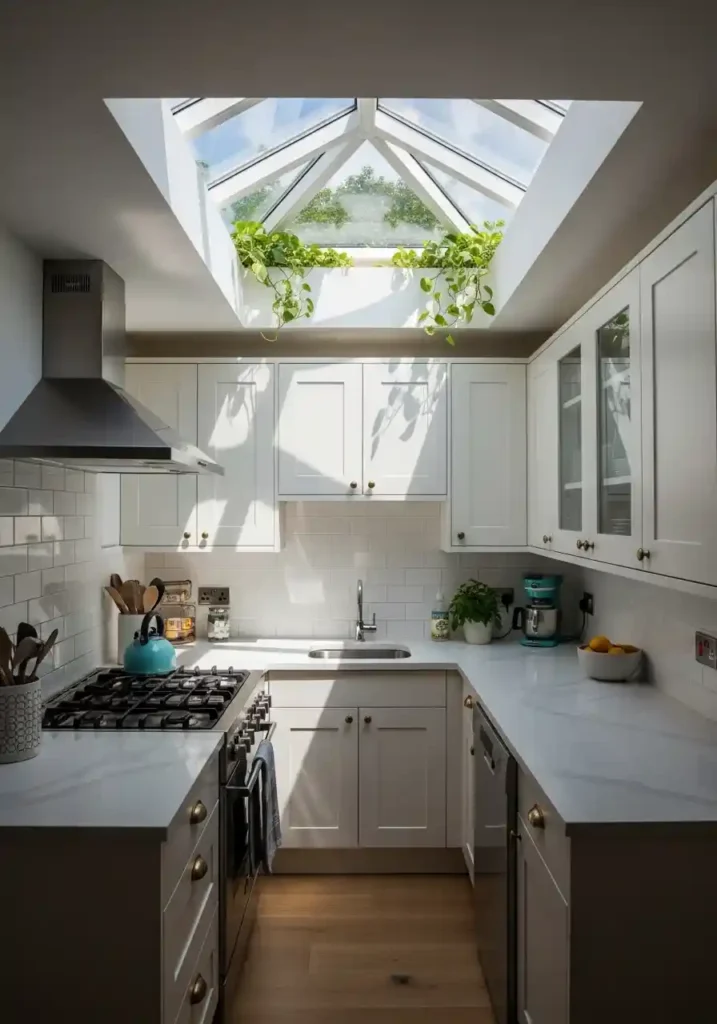 The most magnificently beautiful kitchen skylight remodels are those where the skylight is positioned above the primary cooking and preparation zone — flooding the specific area where natural light matters most for genuine food preparation and daily cooking pleasure! A flat rooflight with minimal visible frame creates the most architecturally clean and the most visually unobtrusive result. White kitchen surfaces maximizing the reflection and distribution of skylight illumination throughout the compact space. Living plants thriving in the abundant natural light becoming more beautiful and more productive than they were before the skylight’s installation.