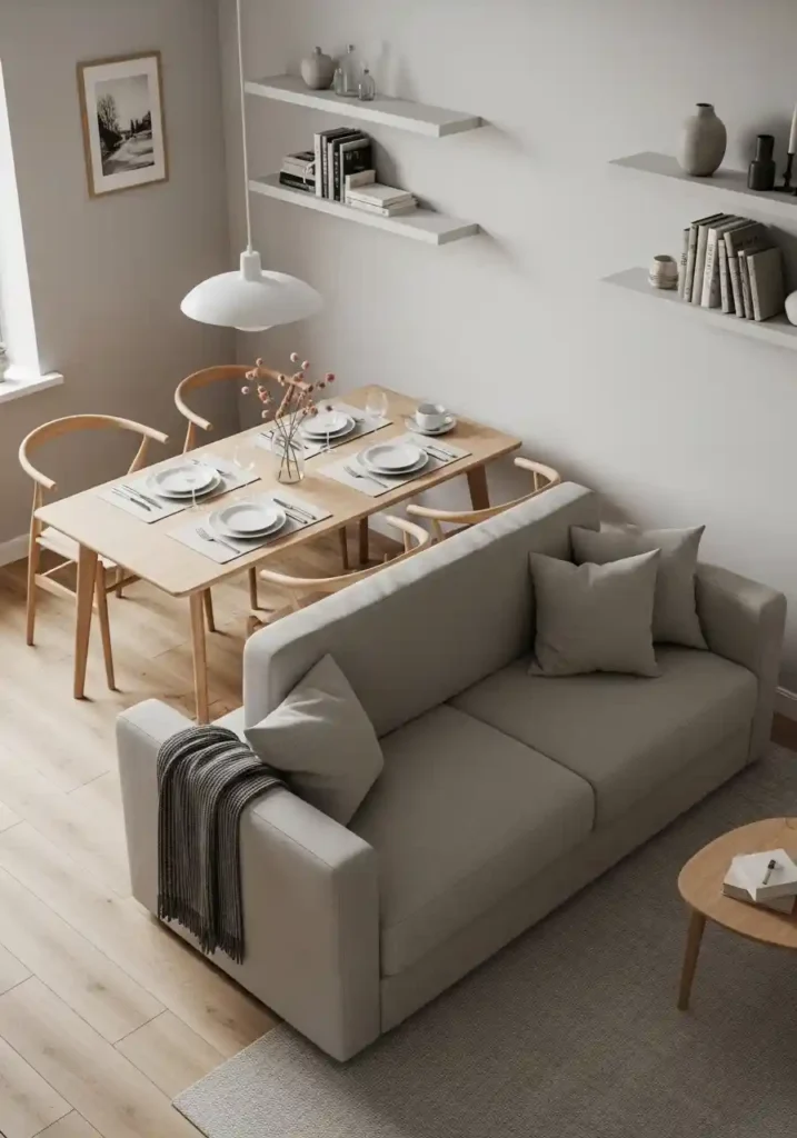 Positioning the sofa with its back facing the dining table creates one of the most naturally functional and most space-efficient dividing strategies available for small combo rooms. The sofa’s back becomes an informal visual wall between the two zones — separating the eating area from the relaxing area without consuming any additional square footage or requiring any structural modification. A sofa with a clean, attractive back upholstery specifically benefits this layout since the back becomes a visible design element rather than a hidden one.