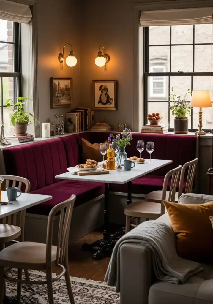 A built-in banquette transforms the dining zone of a small combined room by converting one or two walls into seat-providing structures rather than simple wall surfaces — the walls do the seating work and the floor space that chair backs would otherwise occupy is returned to the room as open circulation area. A corner banquette is the most spatially efficient configuration, fitting into a corner that no freestanding furniture arrangement could use as effectively and creating a dining setup that comfortably seats four to six people in a significantly smaller floor footprint than a conventional table-and-chairs arrangement.