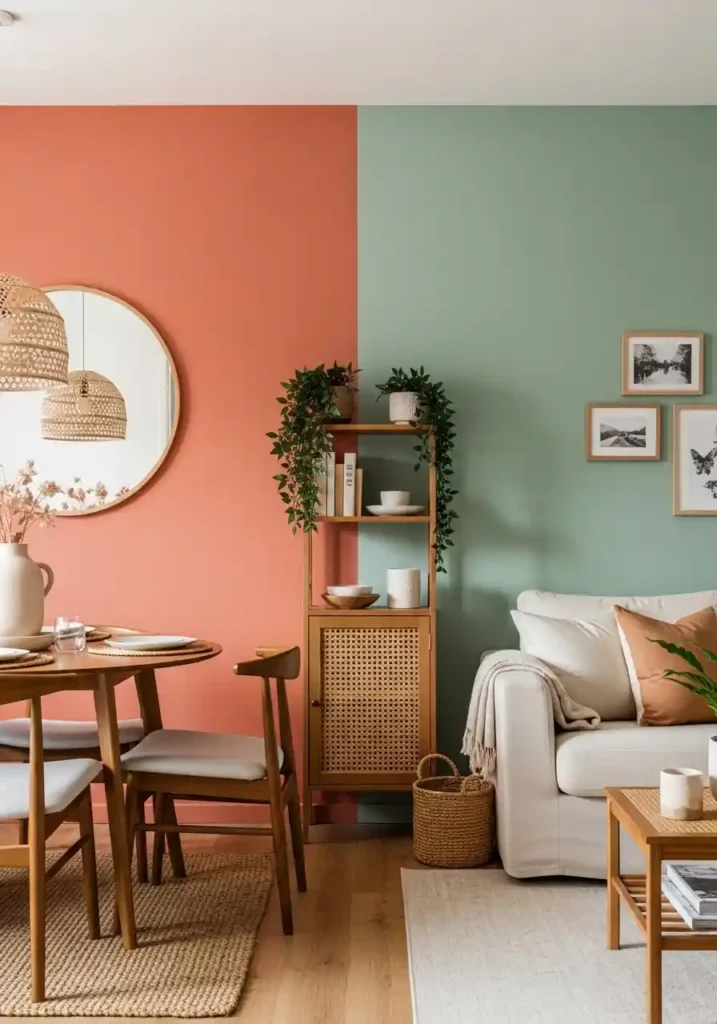 Choose two colors that are in the same temperature family — two warm earth tones, two cool naturals, or two neutral-adjacent shades — so that the two zones feel like chapters in the same color story rather than competing decorative schemes. The furniture throughout both zones can remain in a consistent neutral palette that bridges the two accent colors, allowing the color on the walls to do the zoning work while the furniture maintains a cohesive, unified aesthetic across the complete combined space.