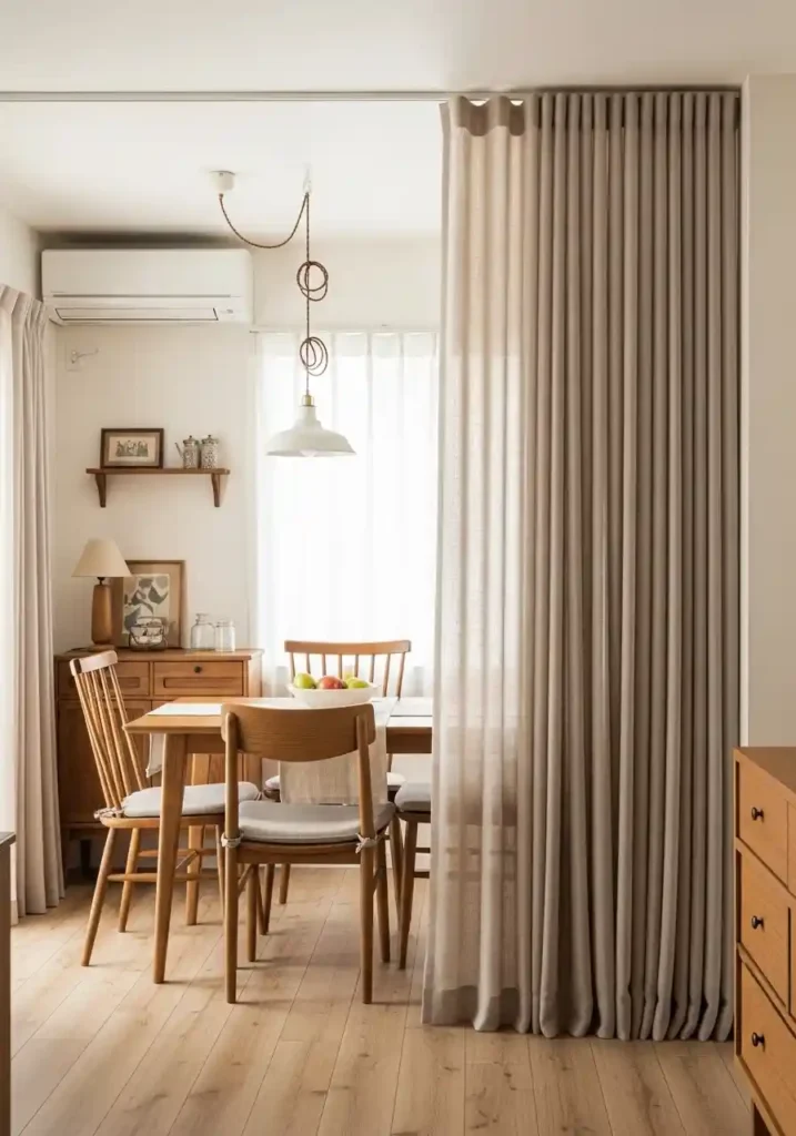 A ceiling-mounted curtain track installed at the zone boundary between the living and dining areas creates the most flexible and most genuinely transformable dividing system available for combined rooms — the curtains can be drawn completely to create two separate rooms with full visual privacy between them, or pulled back entirely to create the open combined space, or positioned partially to create a softly defined boundary without complete separation. No other zoning strategy offers this level of moment-by-moment spatial adaptability.