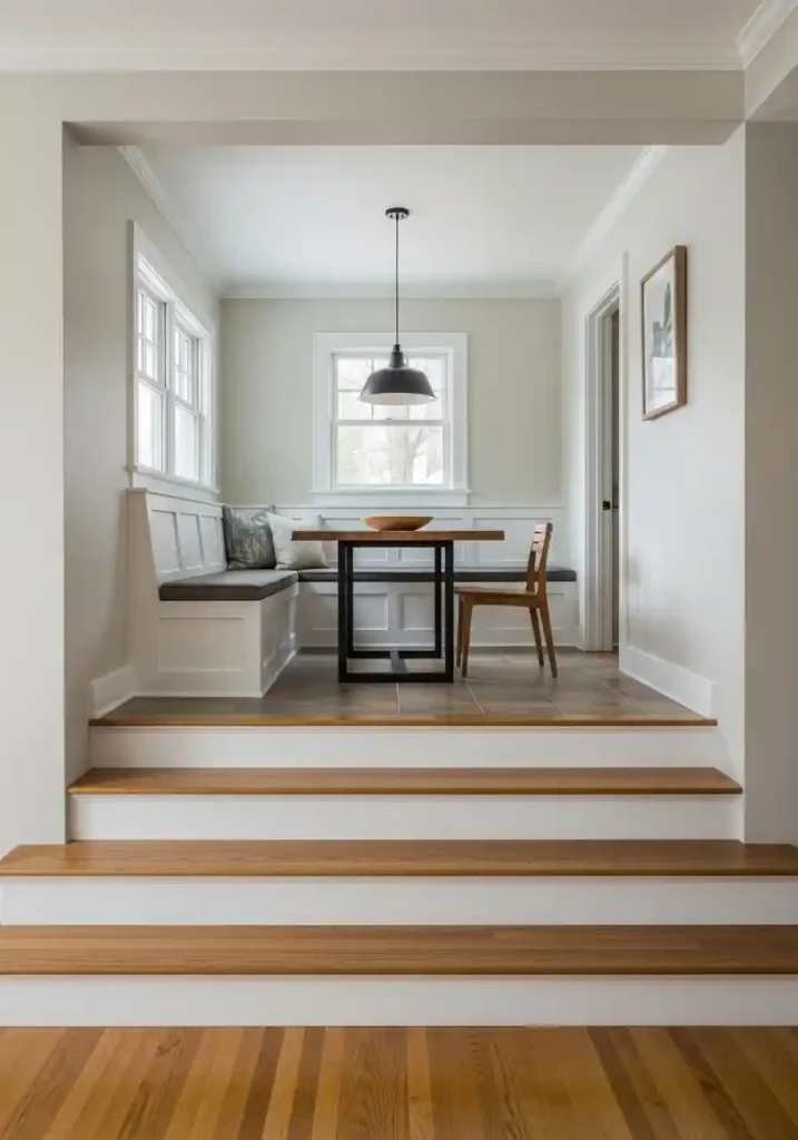 The elevated dining zone layout creates the additional benefit of making the dining area feel like a destination within the home — a specific, deliberately chosen place for gathering and eating rather than simply a corner of a larger room where a table happens to sit. The step change also creates an opportunity for built-in storage within the platform structure, adding cabinetry space beneath the elevated floor that would otherwise be inaccessible. Design the platform’s edges with care for safety and aesthetic coherence.