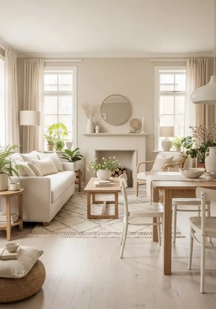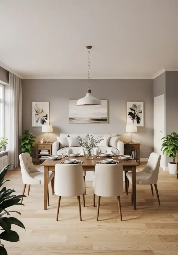 A single tonal palette applied consistently across both the living and dining zones creates one of the most effective and most visually sophisticated spatial expansion strategies available for small combined rooms — when walls, furniture, textiles, and decorative elements occupy the same family of tones, the eye moves freely through the space without the friction of color contrast, making the room appear significantly more spacious than rooms with multiple competing color families. The zones are differentiated by form and function rather than by color contrast.