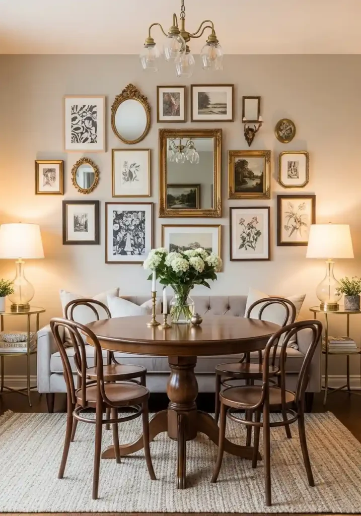 A gallery wall installed above and behind the dining table creates a powerful visual anchor that communicates the dining zone’s territorial ownership of that specific area of the combined room — the gallery wall makes the dining area feel like it has its own distinct backdrop and its own specific identity within the open layout, creating the psychological feeling of separate rooms without any physical division. The visual weight of a gallery wall also creates depth and personality that makes the dining area feel more considered and more specifically designed.