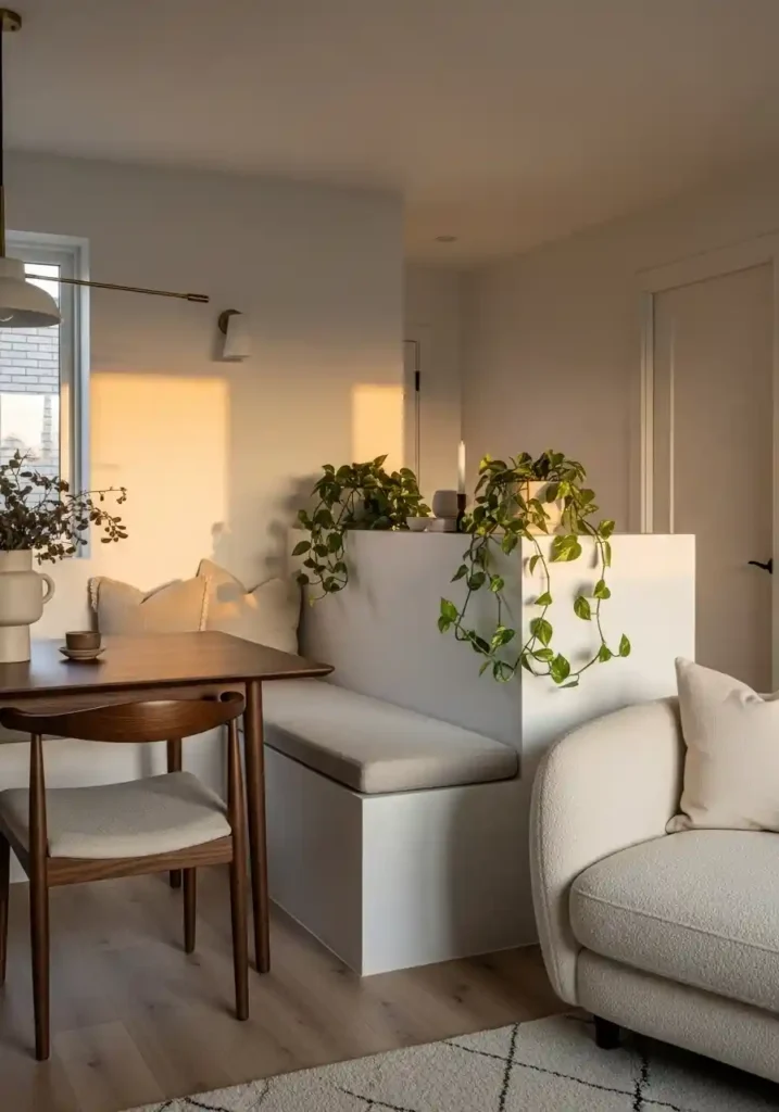 A low built-in bench or half-wall structure positioned at the boundary between the living and dining zones creates the most architecturally permanent and most spatially sophisticated of all zone-defining strategies — the physical low structure creates a genuine, tangible boundary between the two areas while remaining low enough to preserve sight lines and the open, airy quality of the combined space. A built-in bench at this boundary serves triple duty as zone divider, seating for the dining table, and occasional overflow seating for the living area.