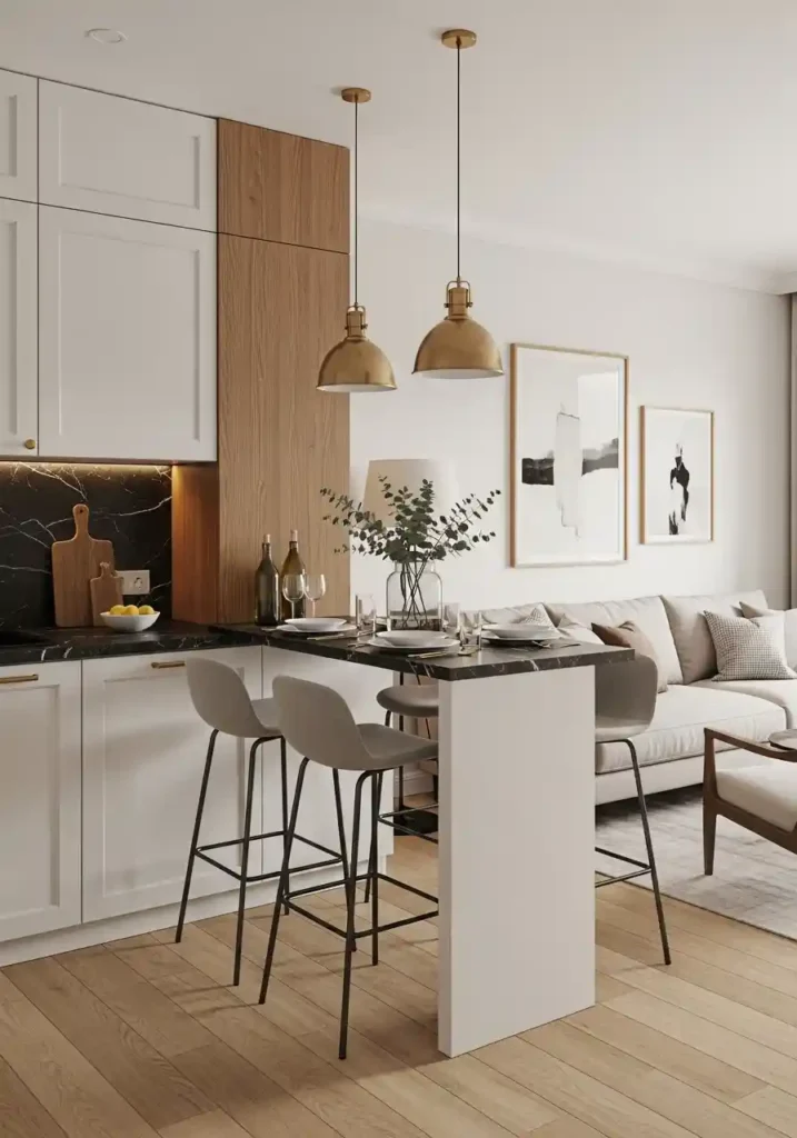 For a small combined room where a full island is not proportionally appropriate, a slim bar cart or a narrow console-height unit with stools creates a similar spatial logic at a fraction of the floor space. The key is positioning the piece perpendicular to the walls so that it creates a physical zone boundary rather than running parallel to the walls where it would simply be furniture against a perimeter. A mobile bar cart is the most flexible and most space-adaptable version of this zoning concept for the smallest combo rooms.