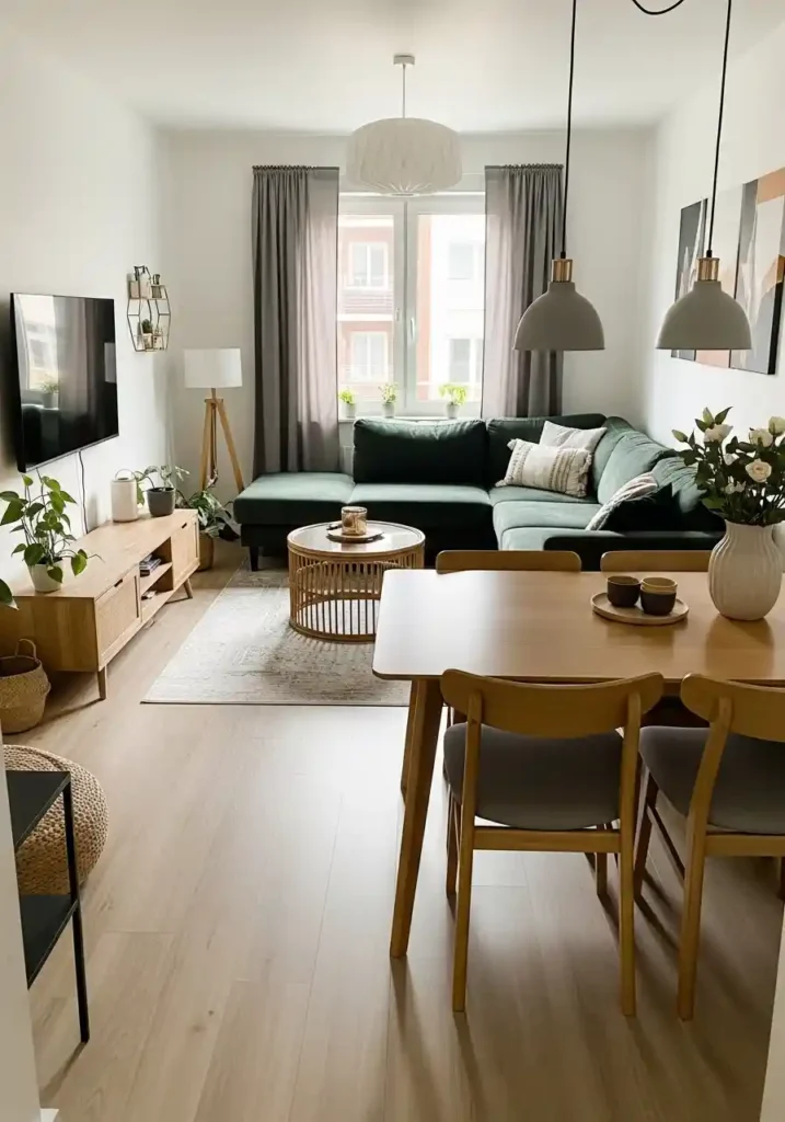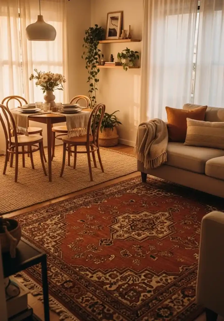 The proportional size of each rug matters enormously in a small combo space — a dining rug should extend at least sixty centimeters beyond the table on all sides so that chairs remain fully on the rug when pulled out, and the living rug should be large enough that the front legs of the sofa sit on its surface. These two proportional choices create the most professionally designed and most spatially intelligent rug-zone layout possible in a small combined room. Natural fiber rugs add warmth without visual heaviness.
