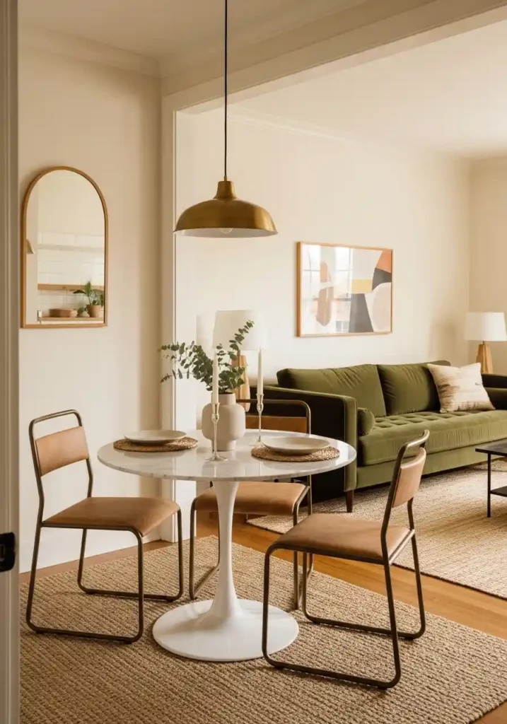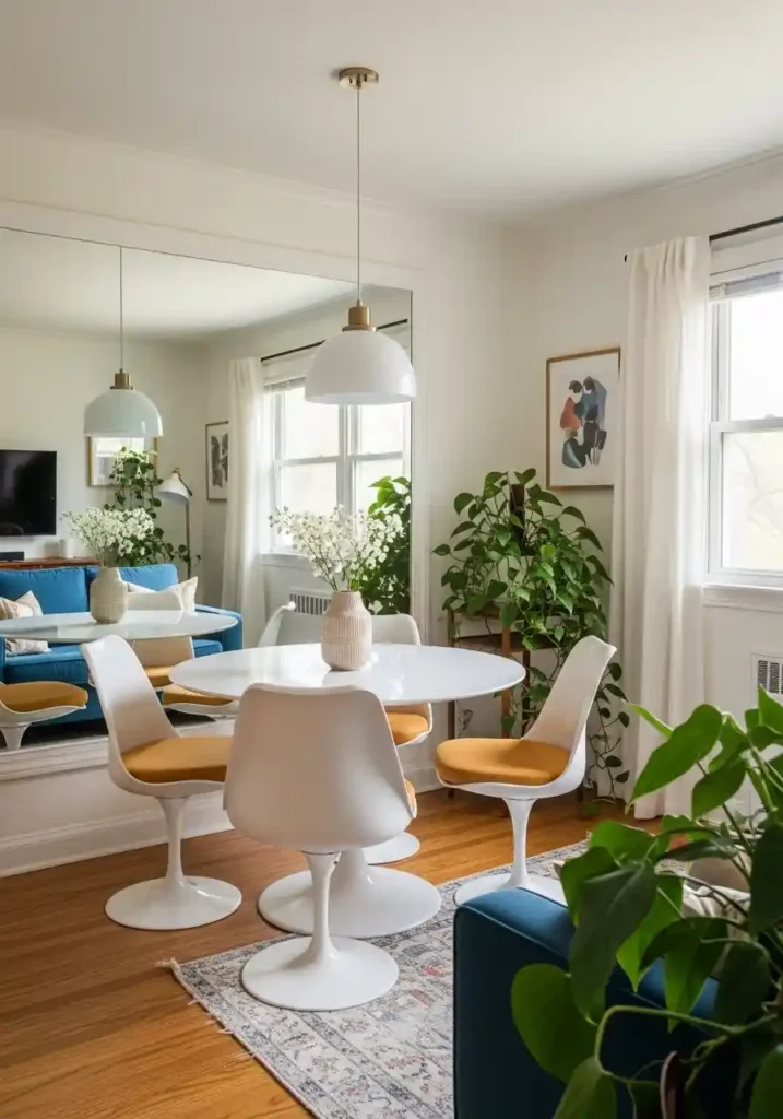 A large mirror installed on the wall behind the dining table is the most immediately dramatic and most cost-effective spatial expansion tool available for a small combined room — the mirror reflects the entire opposite living zone, doubling the visual depth of the room and creating the impression of a second, identical room existing beyond the reflective surface. The reflected light also brightens both zones simultaneously, creating a more airy and more spacious feeling throughout the entire combined space with a single installation.