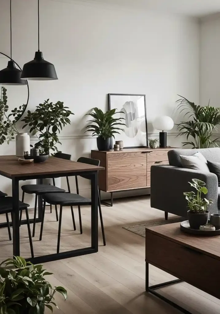 A monochromatic furniture scheme — where all furniture across both the dining and living zones shares the same dominant material or color family — creates a spatially unifying effect that makes a small combined room appear more deliberately designed and more seamlessly integrated than rooms where each zone’s furniture family is visually distinct from the other. When the dining table and the living room coffee table are made from the same wood, or when the dining chairs and the sofa frame share the same metal finish, the room reads as one considered composition.