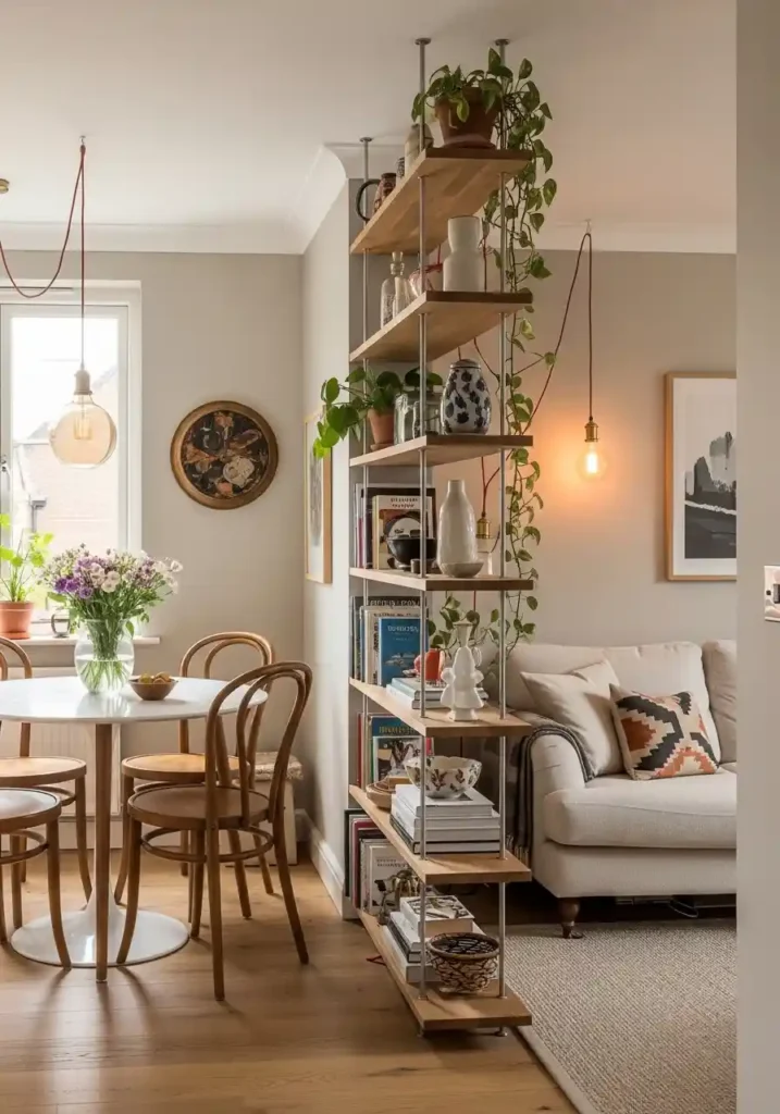 Style the dividing shelf from both sides — books and ceramics facing the living area, practical or decorative items facing the dining area — so that it reads as a thoughtfully designed element from every direction within the room. A shelf positioned no deeper than thirty centimeters divides the space without consuming significant floor area. Maintain the same styling aesthetic on both sides for a cohesive combined room design that appears intentional and specifically designed rather than divided by necessity.