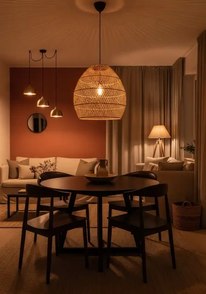 For the living zone, a separate lighting element hung at a different height or in a different style creates a visual distinction between the two areas through lighting language rather than physical structure. The two lighting elements do not need to match — they need to complement each other while being visually distinct enough to announce their separate zone identities. A warm, large-scale woven pendant over the dining table and three small, delicate pendants over the sofa creates the most specifically beautiful and most spatially intelligent lighting-zoning combination.