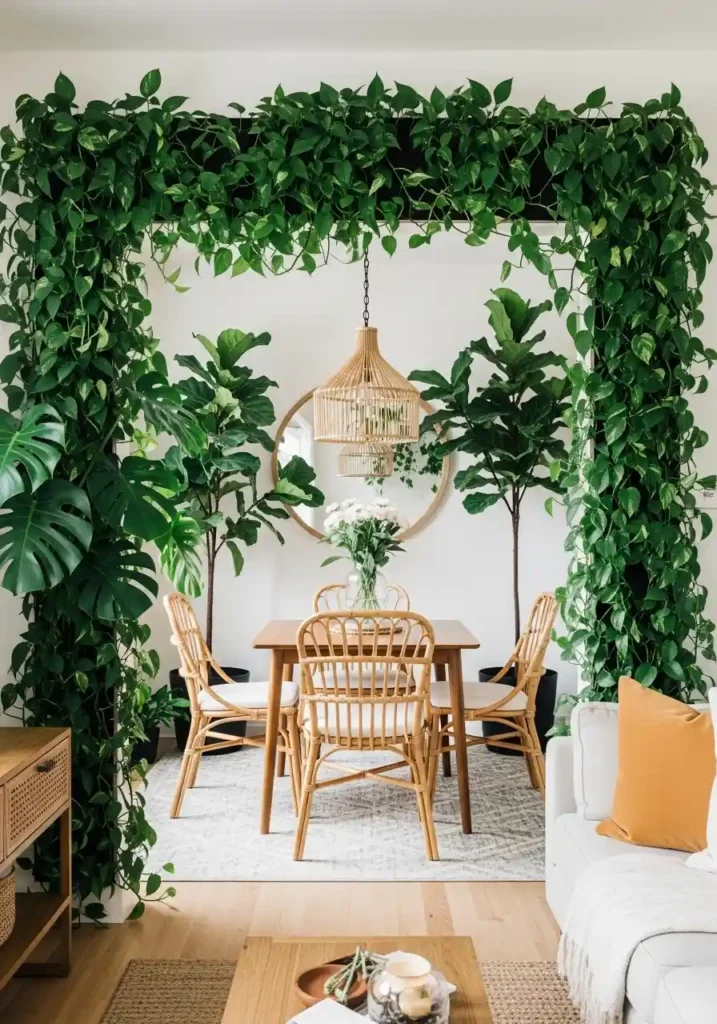 The most effective plant divider combines tall statement plants — fiddle leaf figs, large monstera, or tall snake plants — with medium-height plants on stands and trailing plants that create visual depth at different vertical levels. The layering of different plant heights creates a dividing mass that is visually rich from both the dining and living zone perspectives. Choose plants with large, bold leaves rather than delicate fine-leafed varieties — the bold leaf forms create a more architecturally substantial dividing presence within the combined room.