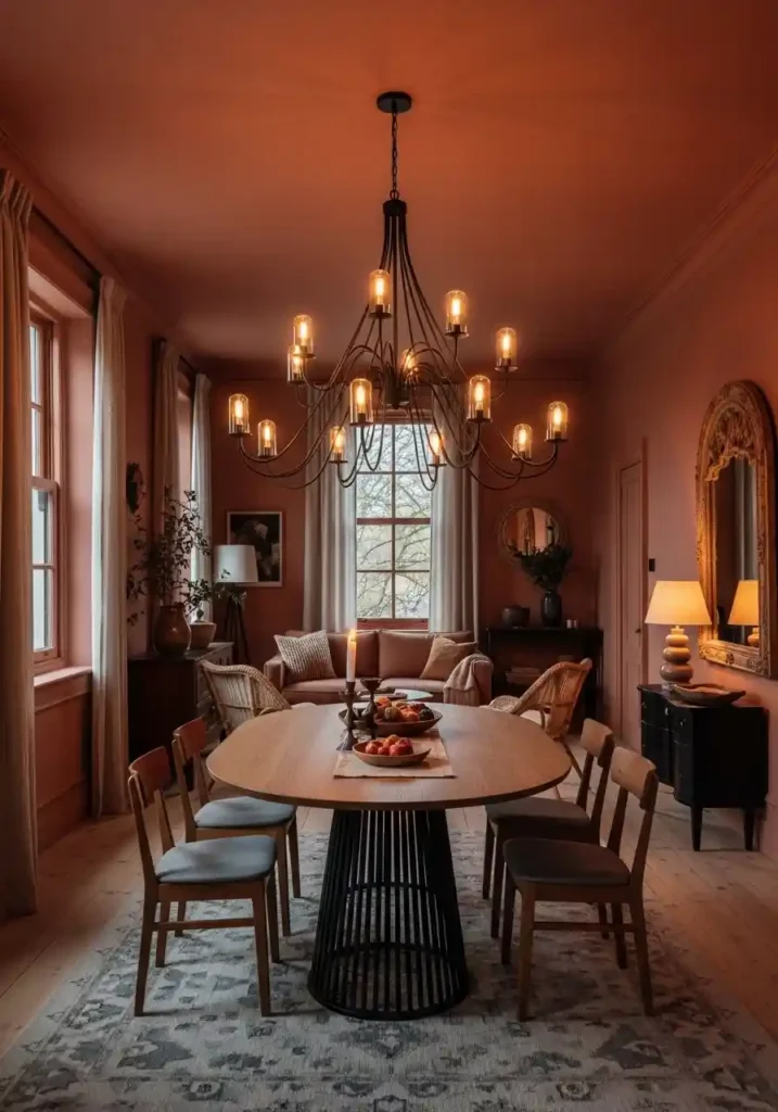 This centering approach works most powerfully in rooms where the ceiling is the space’s most generous dimension — in rooms with standard or higher ceilings, a dramatic sculptural chandelier at the center point creates a focal experience that draws the eye upward and creates vertical drama that makes the horizontal floor plan’s limitations feel irrelevant. Choose a fixture scaled to the combined room’s total area rather than to either individual zone — approximately one-third the width of the room in diameter for the most proportionally commanding centerpiece presence.