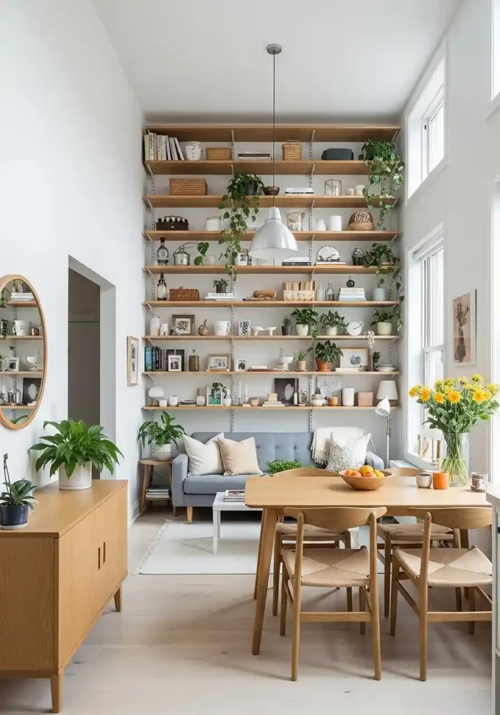 Position the shelving so that it serves both zones simultaneously — lower shelves near the dining area holding items relevant to that space, and lower shelves near the living area holding books and objects relevant to relaxation. The uninterrupted vertical line of the shelving from floor to ceiling creates a powerful visual anchor that makes the ceiling appear higher and the room appear more specifically proportioned than it actually is. Paint shelves and wall the same color to maximize the height illusion.