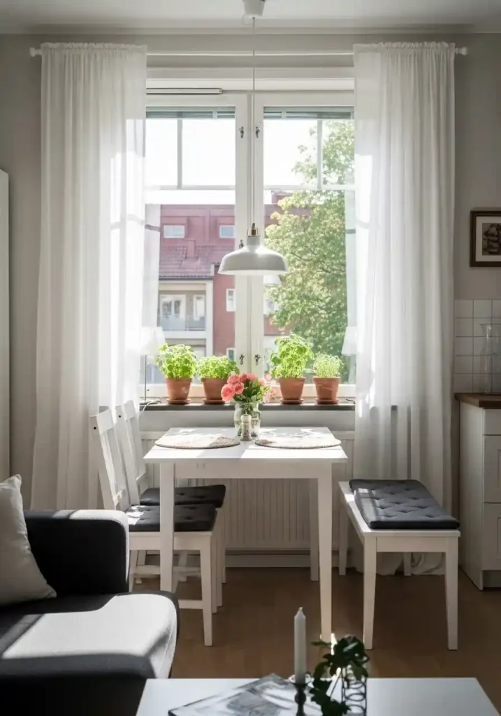 Positioning the dining table directly at the window is the most light-maximizing and most ambiance-enriching dining zone placement available in a small combined room — natural daylight creates the most flattering and most enjoyable dining atmosphere possible, and placing the dining zone at the source of natural light ensures that the eating area has the most pleasant experiential quality in the room. The window-adjacent dining zone also keeps the room’s interior less cluttered with furniture, creating a more open and more breathable living area.