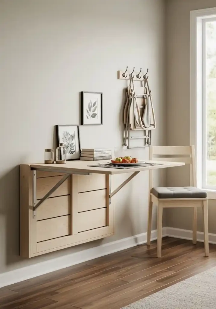 Choose a fold-down table with integrated leg storage so the legs fold neatly into the table surface when not in use, creating the cleanest possible wall profile in the living room configuration. Pair the fold-down table with lightweight, stackable chairs that store elsewhere in the room when not needed — hanging from hooks on the same wall, sliding under a console, or stacking in a corner — to complete the transformable dining setup without adding permanent floor-space furniture to the combined room’s limited capacity.