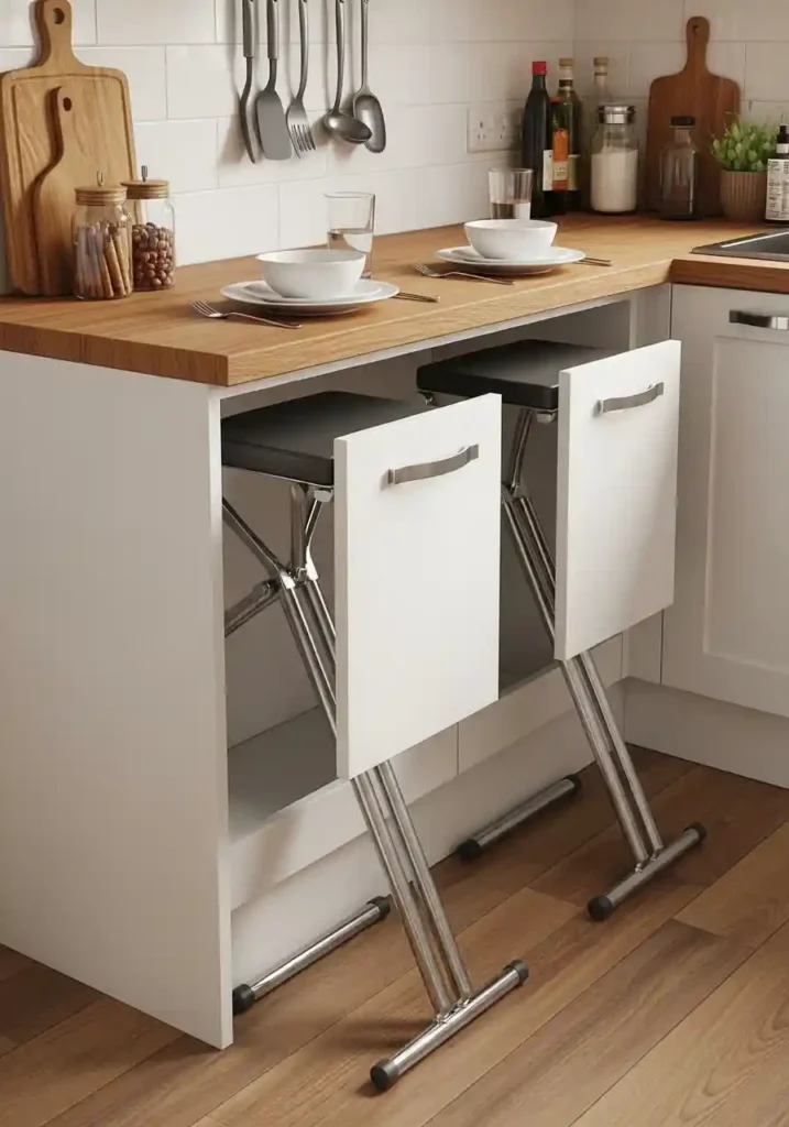 A counter overhang of ten to fifteen centimeters beyond the cabinet base creates a slim bar-height seating zone that accommodates two bar stools that tuck completely beneath the counter when not in use — leaving the kitchen floor completely clear during active cooking while providing genuine, comfortable seating for quick meals, casual coffee, or laptop work at the kitchen counter. This integrated seating approach provides the functional benefit of a dining table within the existing kitchen footprint without the floor space cost of a separate piece of furniture.