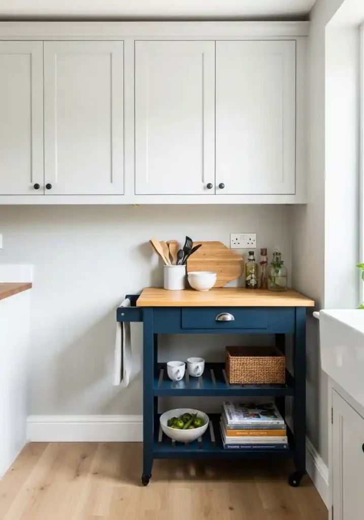 Choose a cart color that complements the kitchen’s existing palette as an intentional accent — a navy blue cart against white cabinetry, a forest green cart against cream cabinetry, or a warm terracotta cart against pale grey cabinetry creates the most aesthetically resolved and the most specifically beautiful contrasting cart result. The cart’s top material and the kitchen’s countertop material do not need to match — a natural butcher block cart top against a white stone kitchen counter creates a warm, specifically layered material contrast that enriches the tiny kitchen’s visual character.