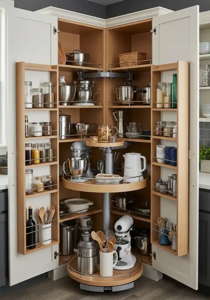 A rotating carousel or lazy Susan shelf system installed within a corner cabinet is the most effective solution for what is typically the most wasted storage space in any tiny kitchen — the deep, dark, awkwardly accessible corner cabinet that swallows items and makes them functionally irretrievable. A full-extension corner carousel with two rotating shelves brings the complete contents of the corner cabinet’s depth to the opening with a single rotation, making every item visible, accessible, and retrievable without the contortion of reaching into a dark corner.