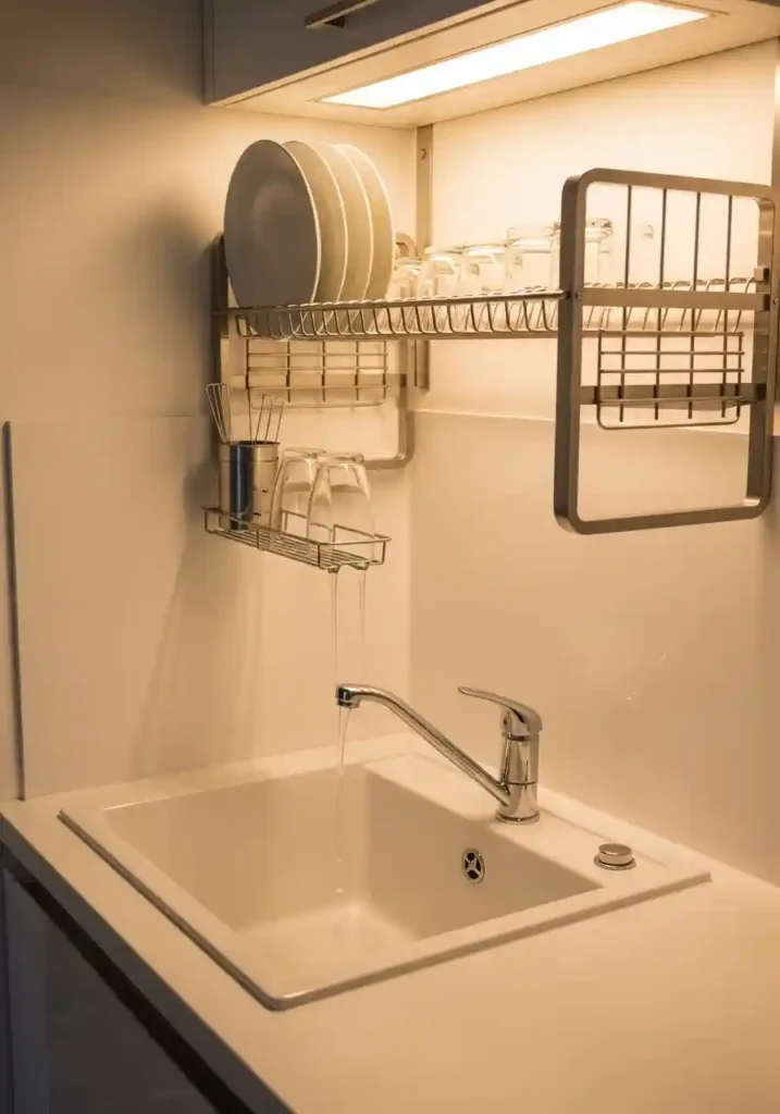 A wall-mounted dish drying rack installed directly above the kitchen sink positions the drying dishes over the sink basin so that drip water falls directly into the sink rather than onto a drying mat that occupies counter space. This arrangement completely eliminates the drying rack’s counter footprint — which in many tiny kitchens occupies the largest single-use dedicated counter space in the entire kitchen — returning that surface entirely to food preparation use while actually improving the drying function by allowing better air circulation around all sides of the drying dishes.