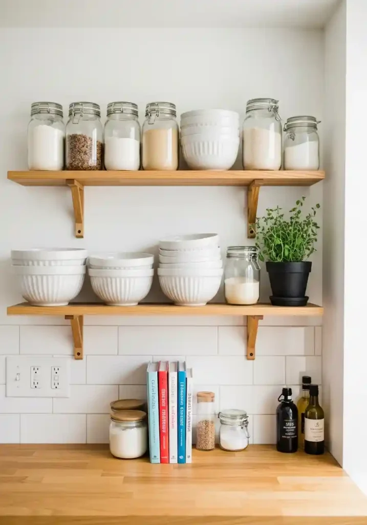 Choose a shelf depth of twenty to twenty-five centimeters — sufficient for single-file storage of most kitchen items without projecting so far into the kitchen’s limited floor space that items on the shelf interfere with counter work. Install floating shelves with concealed brackets or with visible brackets in the hardware finish used throughout the kitchen for the most specifically resolved aesthetic. Style floating shelves with genuine curation — grouping similar items, maintaining clear visual breathing space between groupings, and mixing practical pieces with plants and decorative objects creates a warmly beautiful tiny kitchen display.
